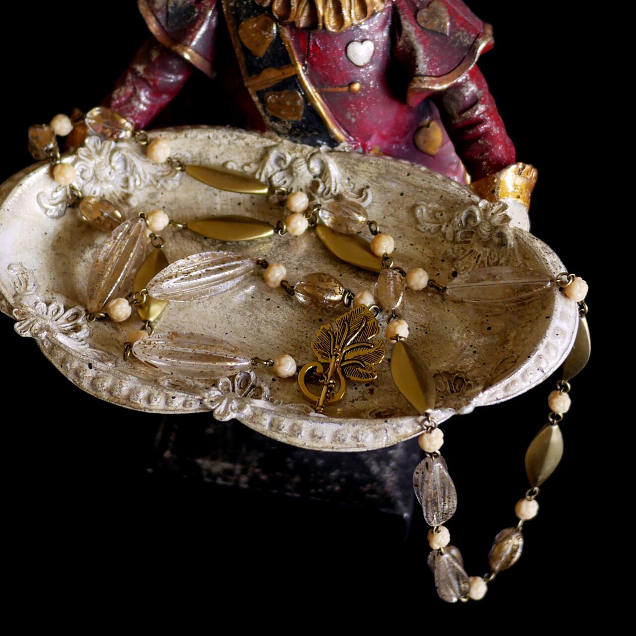 ゴールドを吹き付けたようなクリアなチューブパーツに、マットゴールドのフラットビーズと、チェコビーズを合わせたロングネックレス。